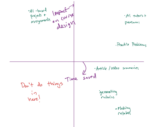 Another way of thinking about where to use it in your curriculum is by borrowing the Impact-Feasibility Matrix framework, and instead adapting it to how you’re thinking about the tool in your classroom. For example, you might think about the way that a given use of AI might impact the course design or experience for your students vs. how much time it might save you in prep and planning, as I have done here: